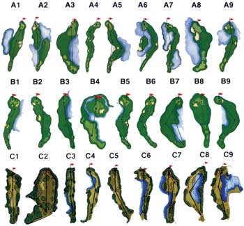The fairways are fairly open with splendid clover-leaf bunkering defining the holes, en route to the testing and at times mesmerizing greens. These 27 putting surfaces, sometimes relatively small in size, do not have a single flat spot on them. All your putts will be breaking left or right, up or downhill - or any combination of those movements. In a similar fashion the fairways, which are also splendidly contoured, give each hole its own unique character in this relatively compact environment.