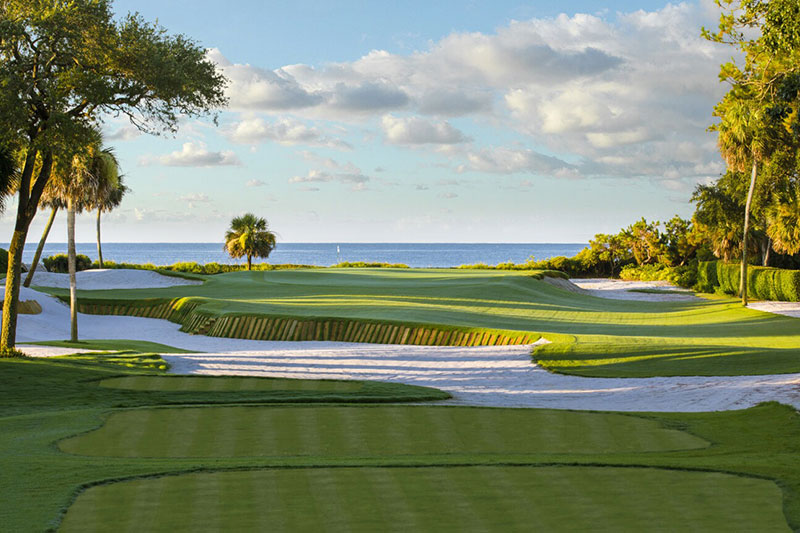 The par-4 finishing hole is among the most difficult on the course A canal creates a major hazard that requires golfers to hit their drive over 220 yards in order to reach the fairway. A safe lay-up approach with a fairway wood is also an option for a solid par.